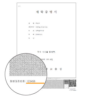 증명서번호 예시 (※ 증명서번호에 알파벳이 포함된 경우 알파벳까지 입력해 주세요)